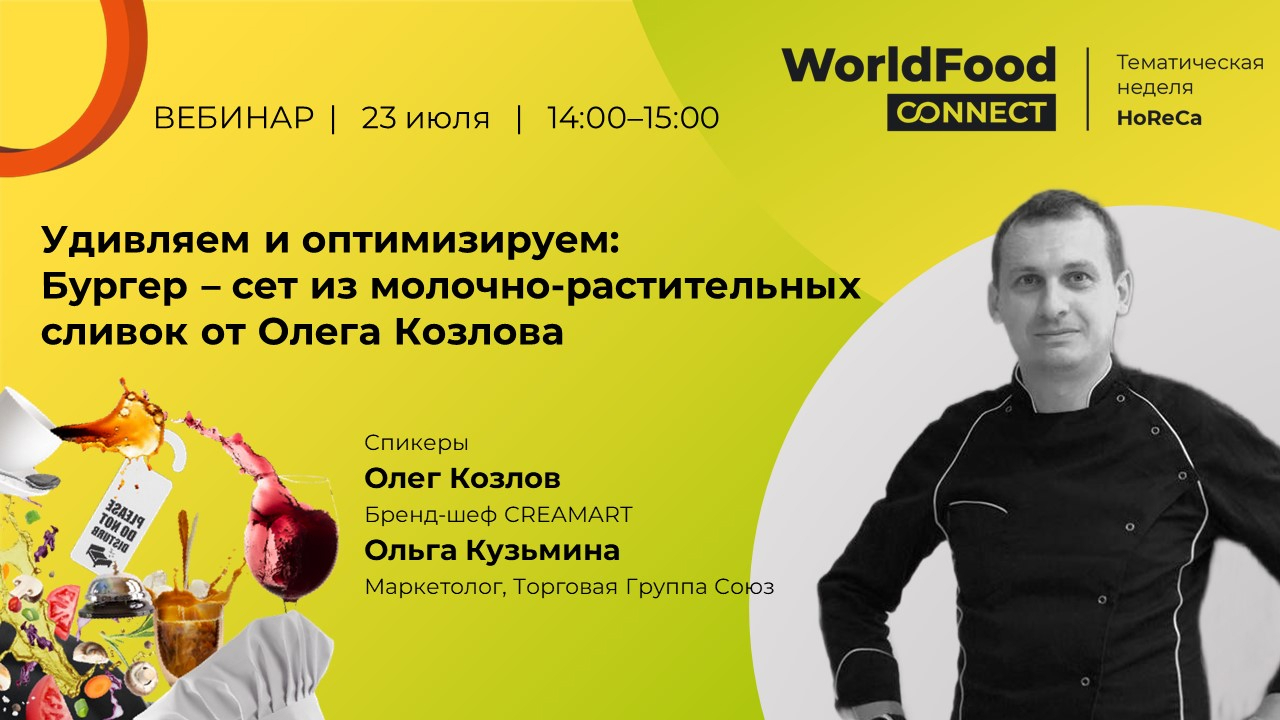 Приглашаем 23 июля в 14.00 по МСК на вебинар – мастер-класс в рамках недели HoReCa «Удивляем и оптимизируем: Бургер – сет из молочно – растительных сливок от Олега Козлова».